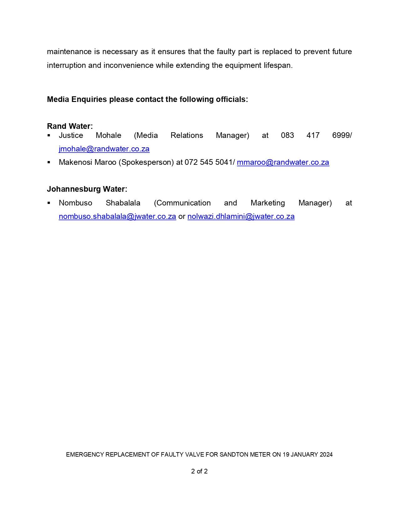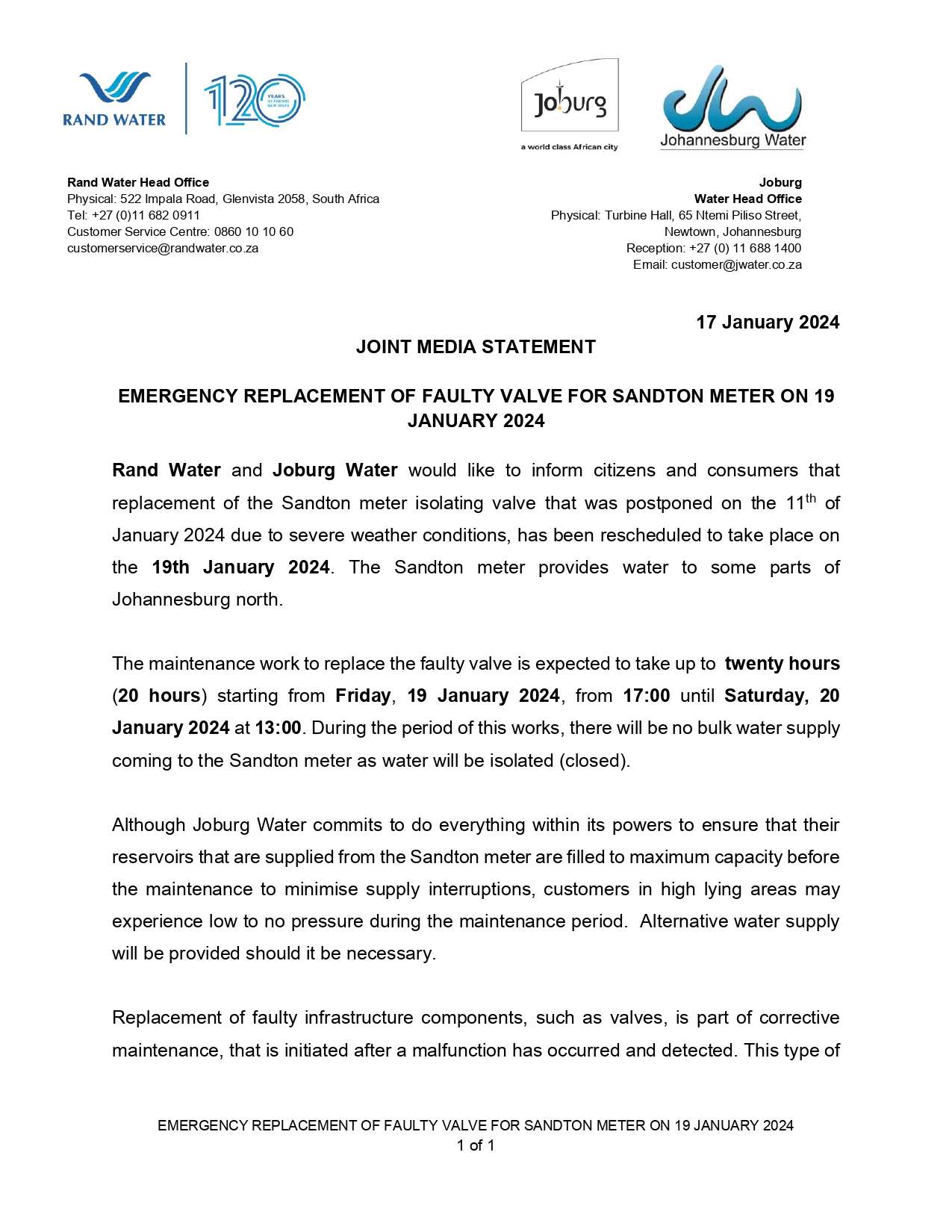 Joint Media Statement between RW and Johannesburg Water – re-scheduled maintenance of the Sandton meter on 19 January 2024 by l3rato | Jan 19, 2024 | Media Statement, Media Statements 2024
