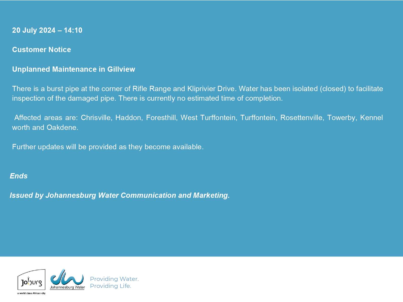 Issued by: Johannesburg Water Communication and Marketing.