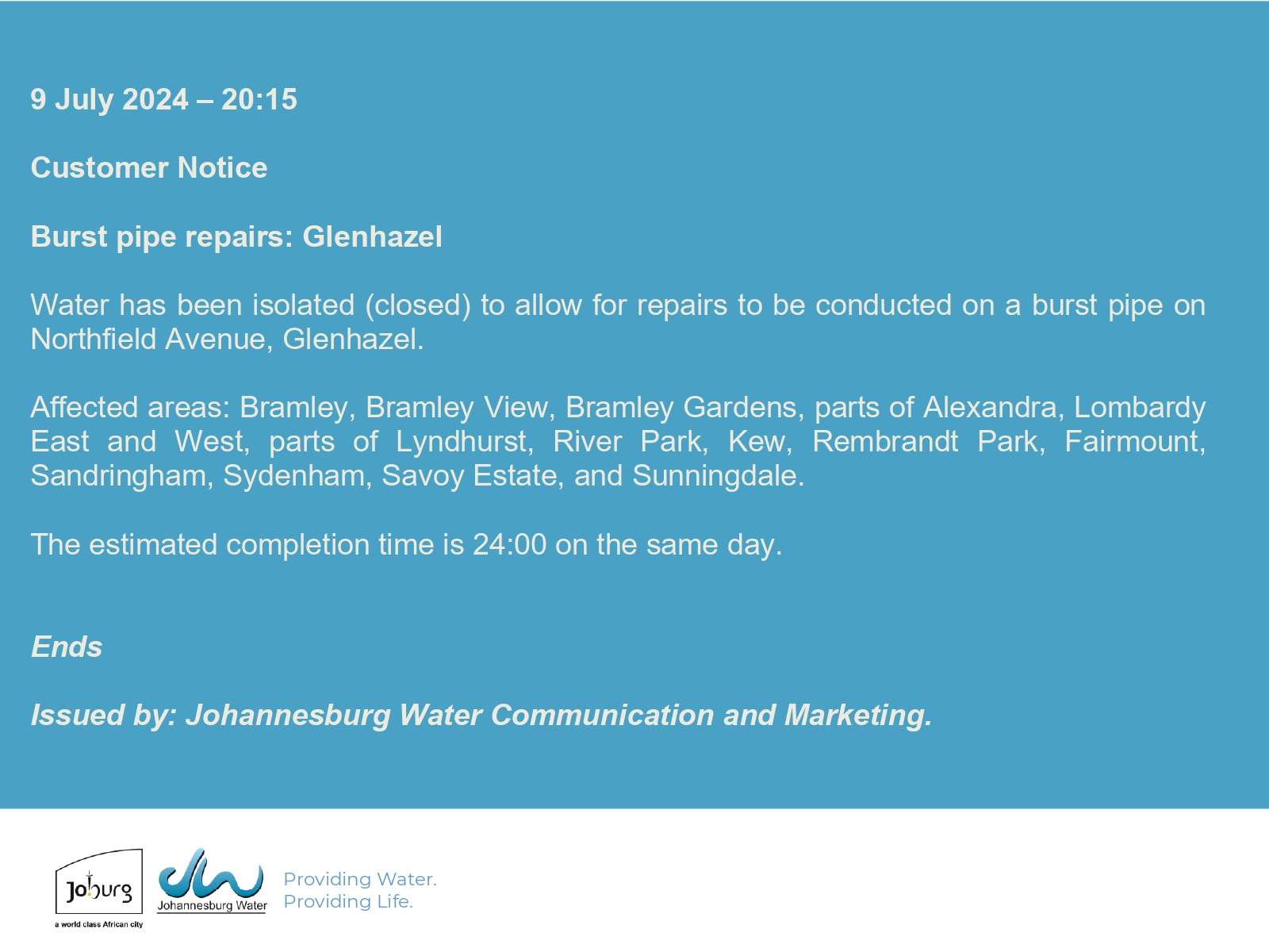 Johannesburg Water will closely monitor all systems and continue to provide alternative water supply to affected customers.