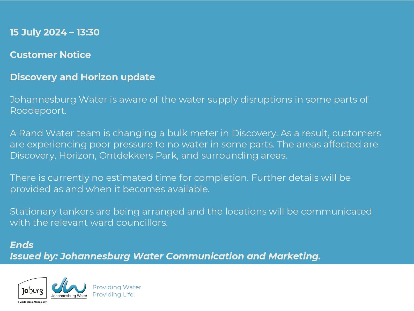 Issued by: Johannesburg Water Communication and Marketing.