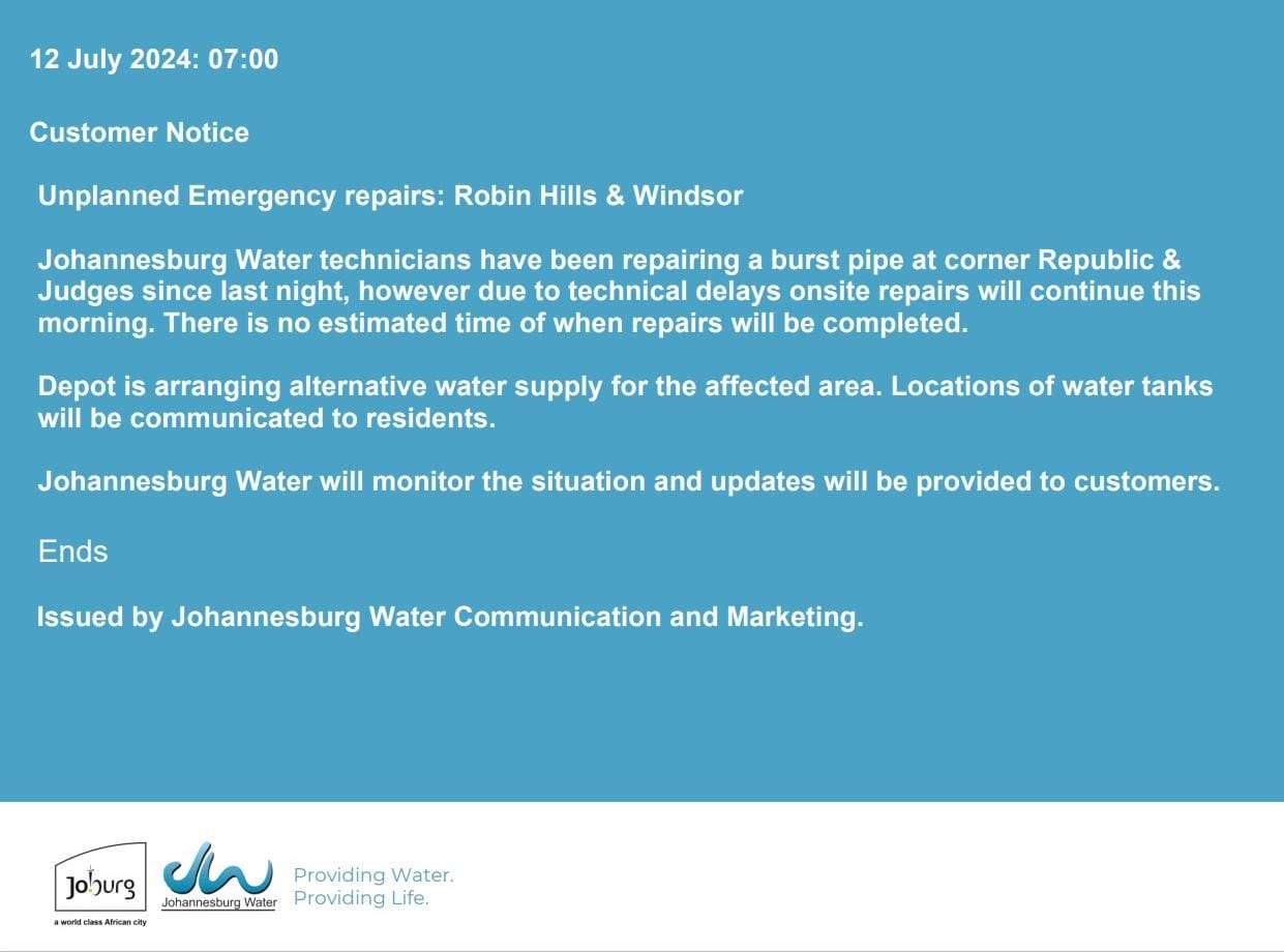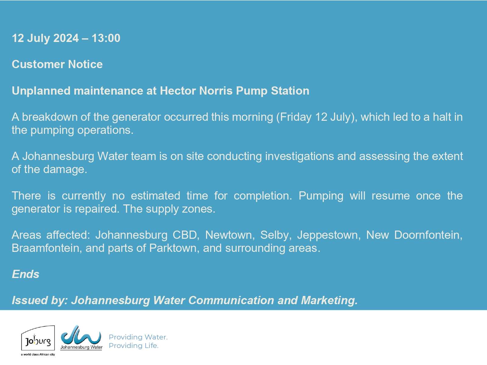All Johannesburg Water systems that are supplied by Eikenhof are improving and supplying fairly, to normally. Johannesburg Water continues to monitor all systems.
