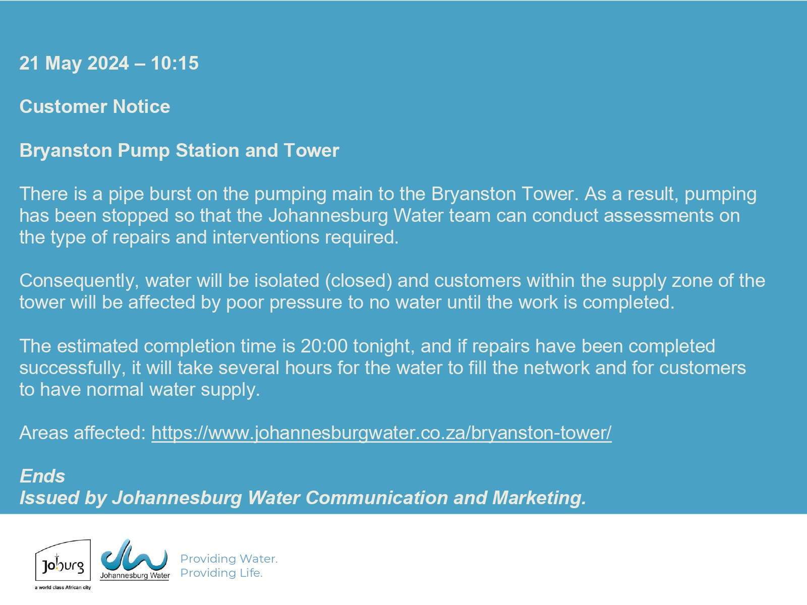 The City Power Bryanorth Substation, Post Office Distributor experienced a trip due to overcurrent, as a result, Johannesburg Water’s Bryanston pump station and tower is affected. The area is affected with no water.