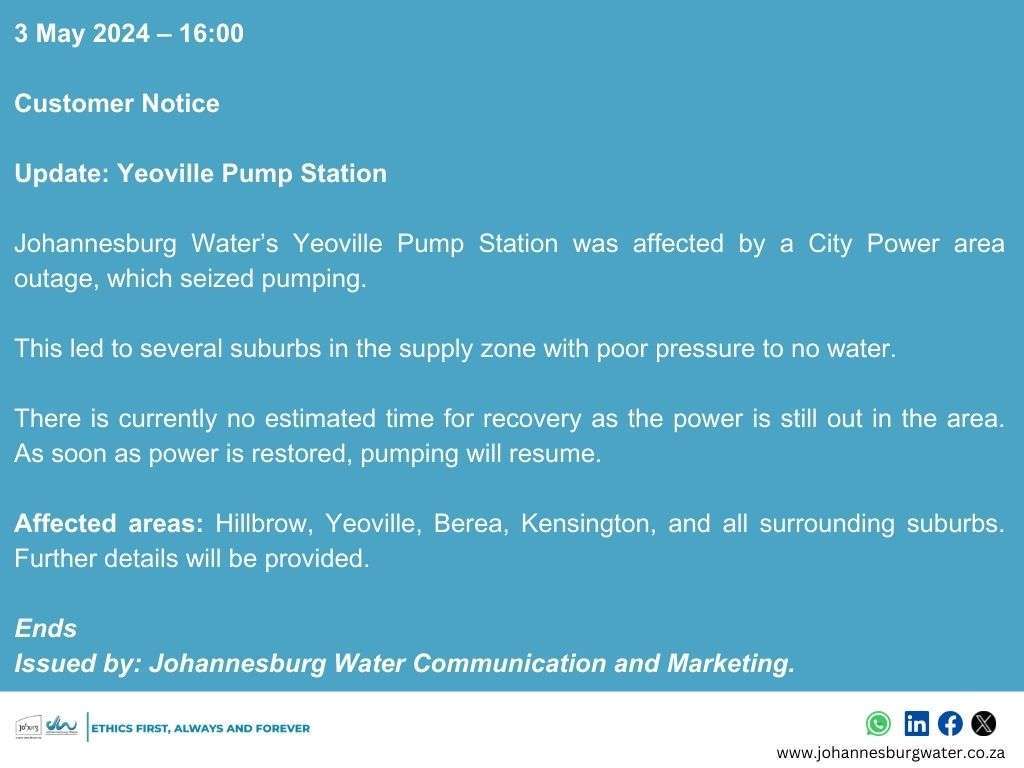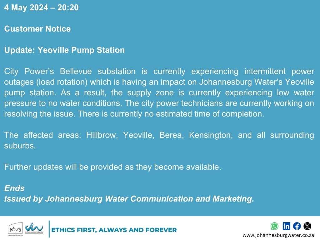 City Power’s central substation experienced a power outage which had an impact on the Johannesburg Water’s Yeoville pump station.