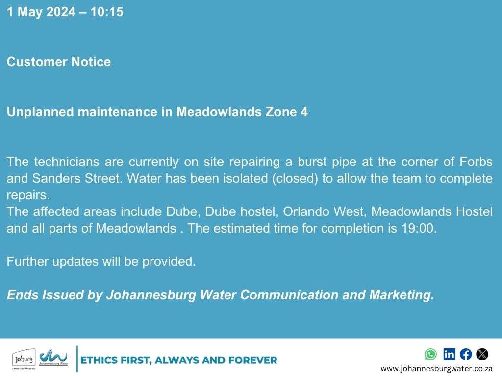 Affected areas include: Braamfischer, Dantex, Marie Louis, Noordgesis, Doornkop North, Roodepoort deep, Pennyvillec, Soilplatjie, Thulani, Doornkop, green village, Lufhereng, Protea Glen extension 1 to 8, Protea City and Meadowlands.