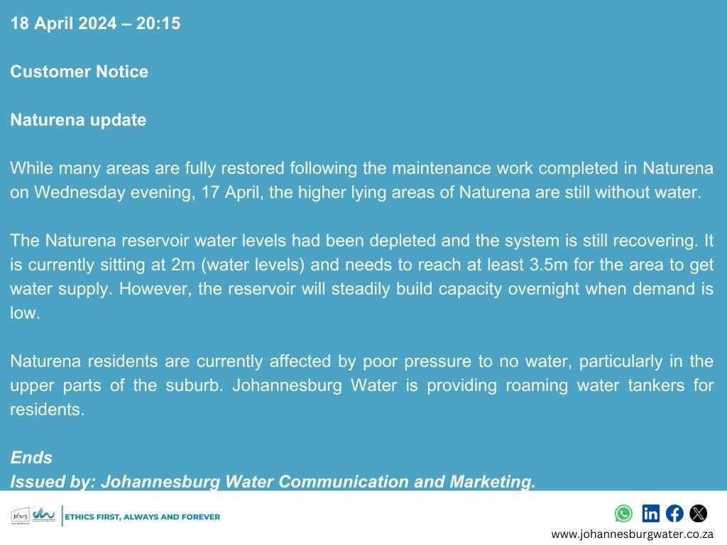 However, improvements are expected overnight. In the meantime, Johannesburg Water continues to provide alternative water supply to the critically affected areas.