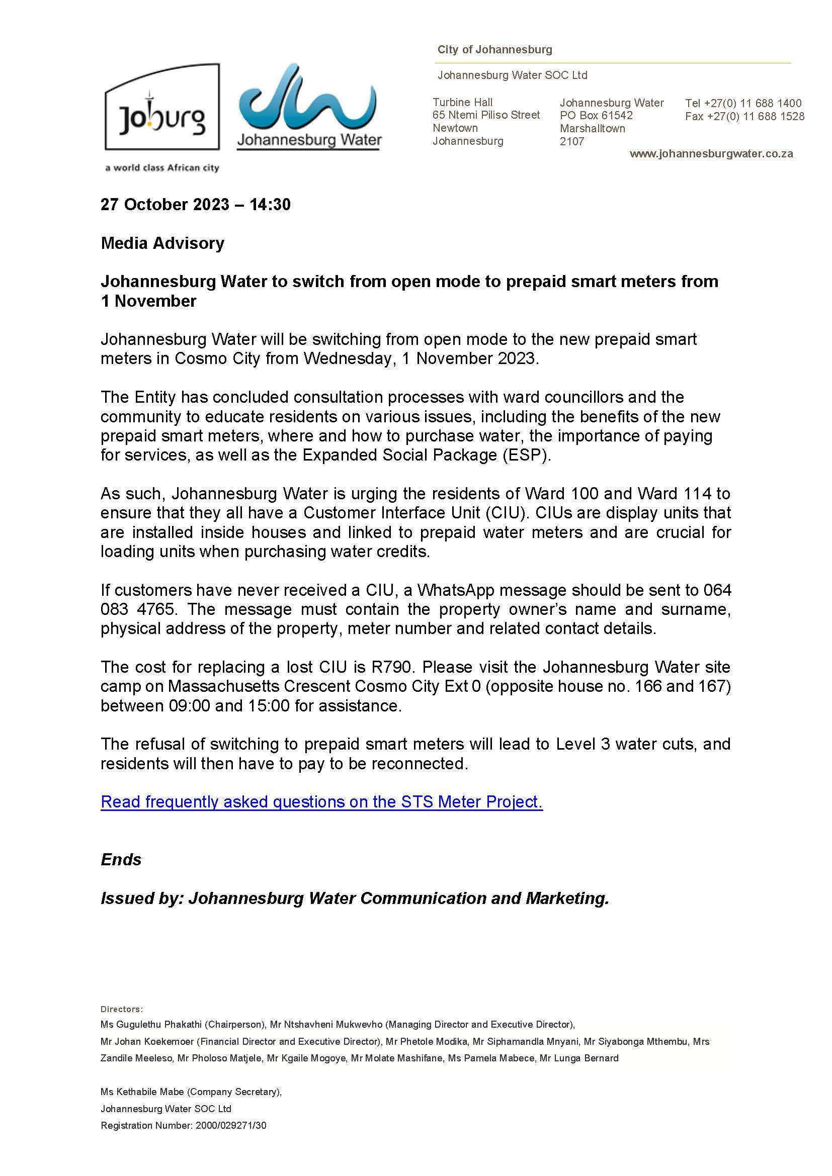 Issued by Johannesburg Water Communication and Marketing.